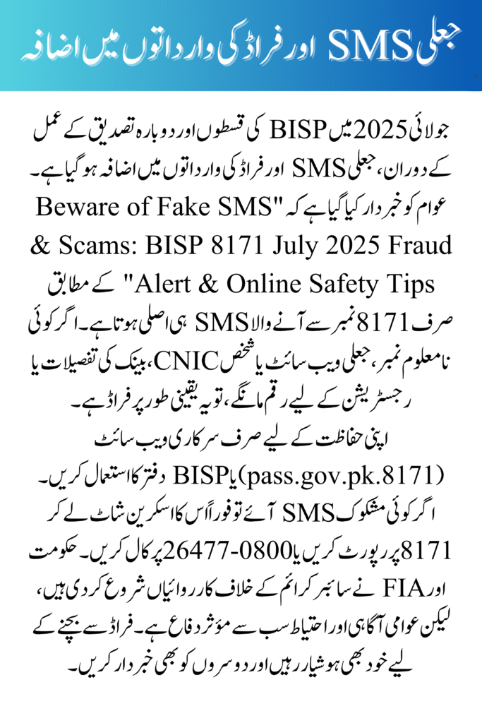 Beware of fake SMS & scams: BISP 8171 July 2025 fraud alert & online safety tips are not just for information—they’re for your protection. Always double-check, report fraud, and spread awareness. No payment or message is worth risking your identity.