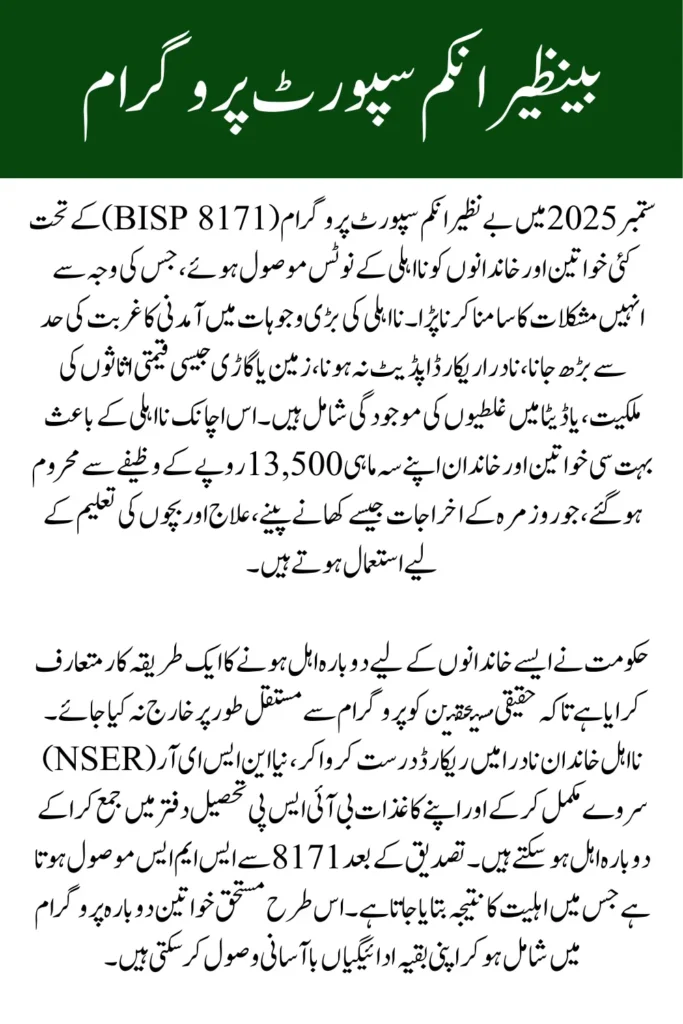 The BISP 8171 disqualification in September 2025 has caused uncertainty for thousands of families. However, disqualification is not the end. By taking prompt action—updating NADRA records, completing the NSER survey, and submitting proper documents—beneficiaries can regain their eligibility.