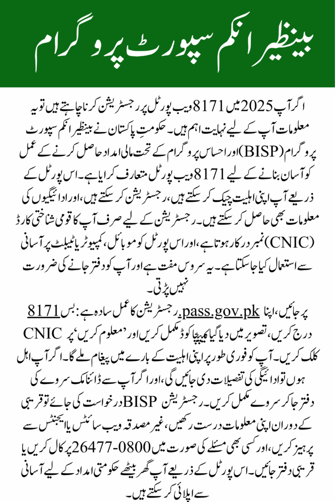 If you’re wondering how to register for the 8171 Web Portal in 2025 – a step-by-step guide for applicants, you’ve come to the right place. As the Government of Pakistan continues to digitize its social welfare services, the 8171 web portal has become a key platform for citizens to check